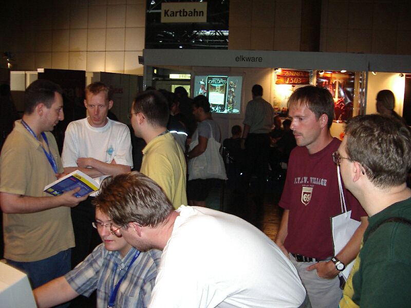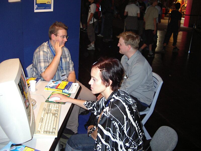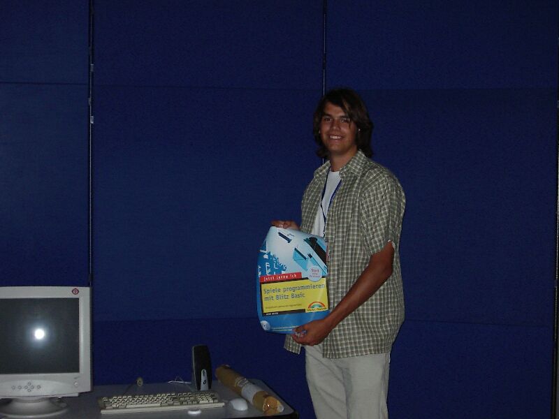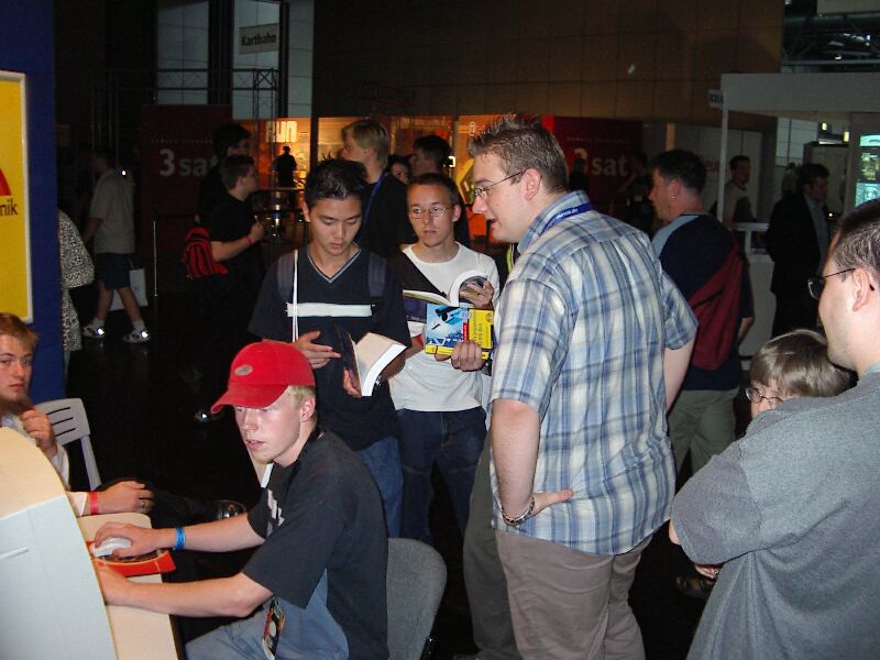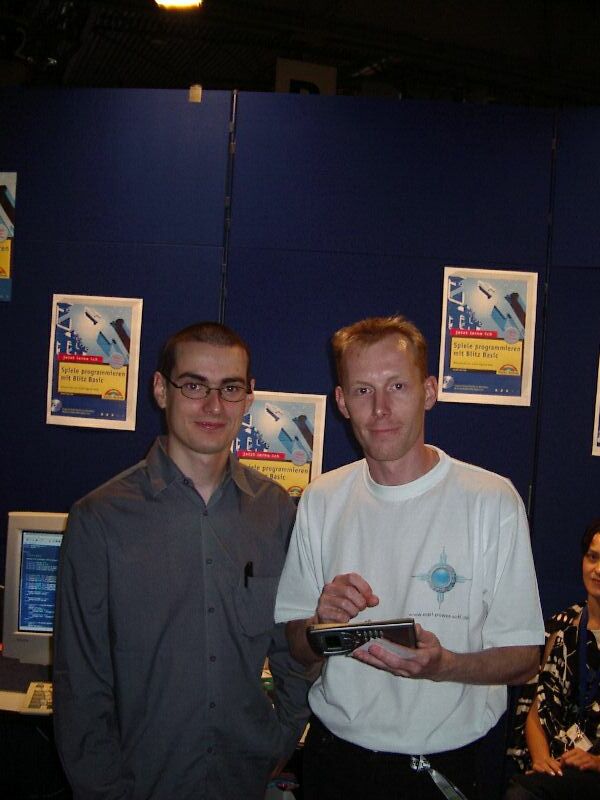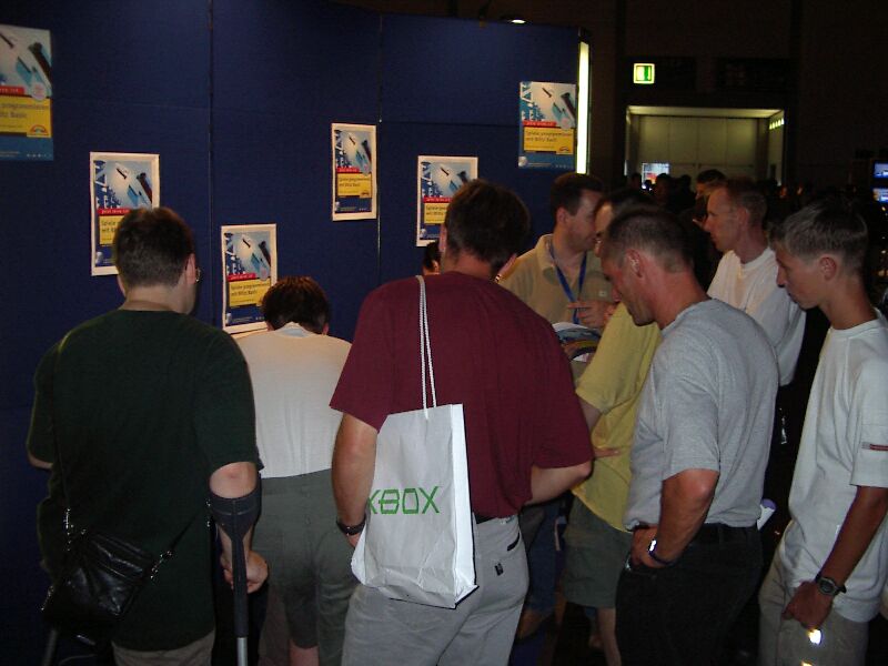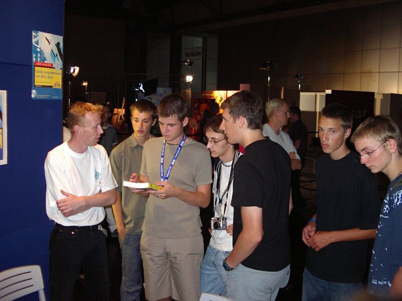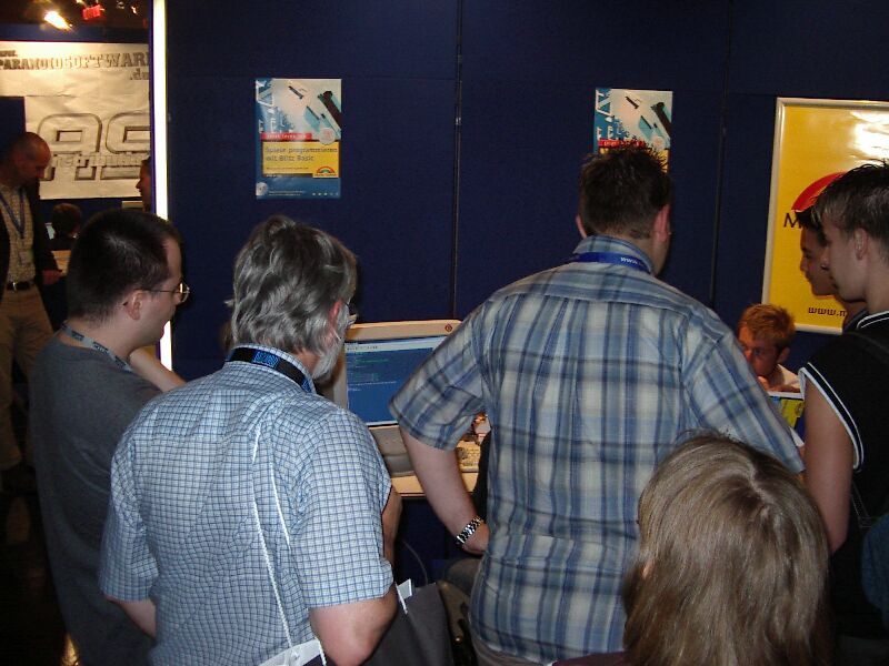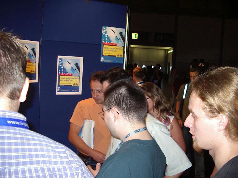 Viele Besucher blieben stehen und wollten näheres erfahren. Teilweise standen mehr als sechs um den kleinen Stand herum. Je nach Interesse probierten sie nur die Demos und Spiele aus, blätterten im Buch, schauten auf die Website oder wollten gleich in den den Programm-Code schauen. Sie waren erstaunt, wieviel wenige Programmzeilen bewirken können. Manche hörten sich längere Vorträge an. Wir denken, daß es sich für Blitz Basic sehr gelohnt hat; viele wollten zu Hause Blitz Basic ausprobierten oder gar das Buch bestellen.