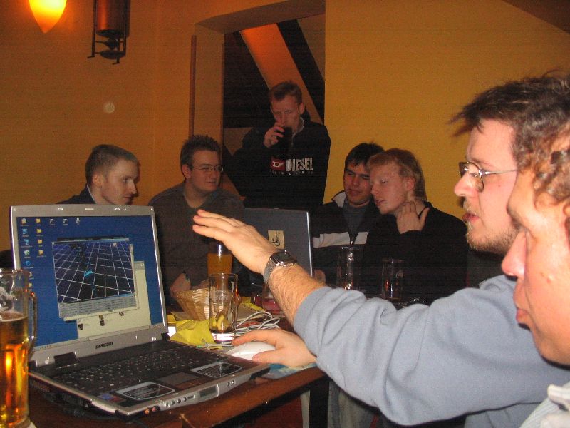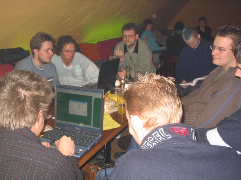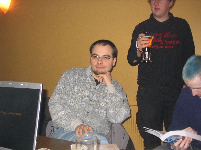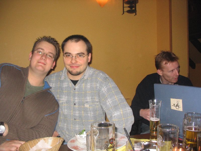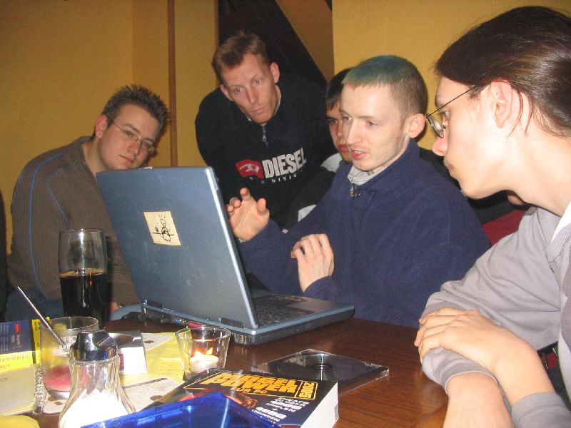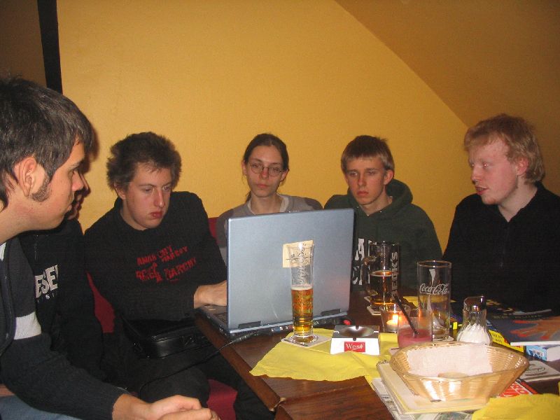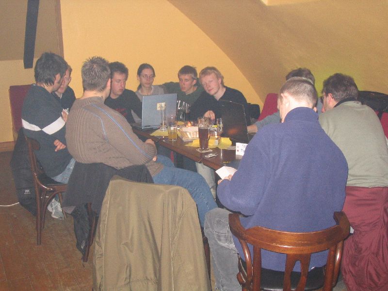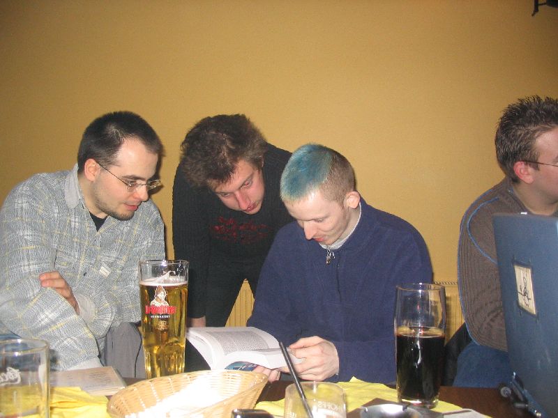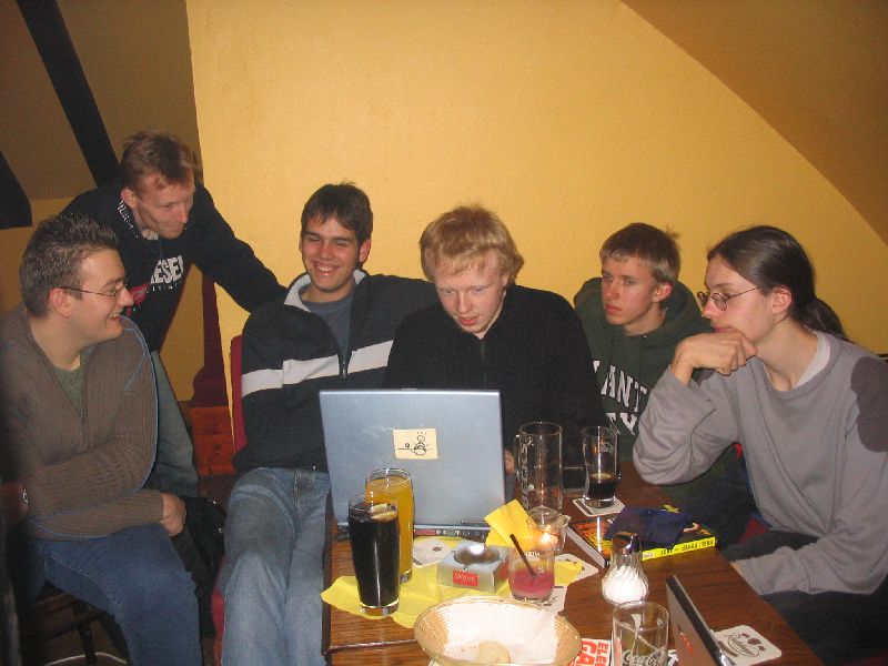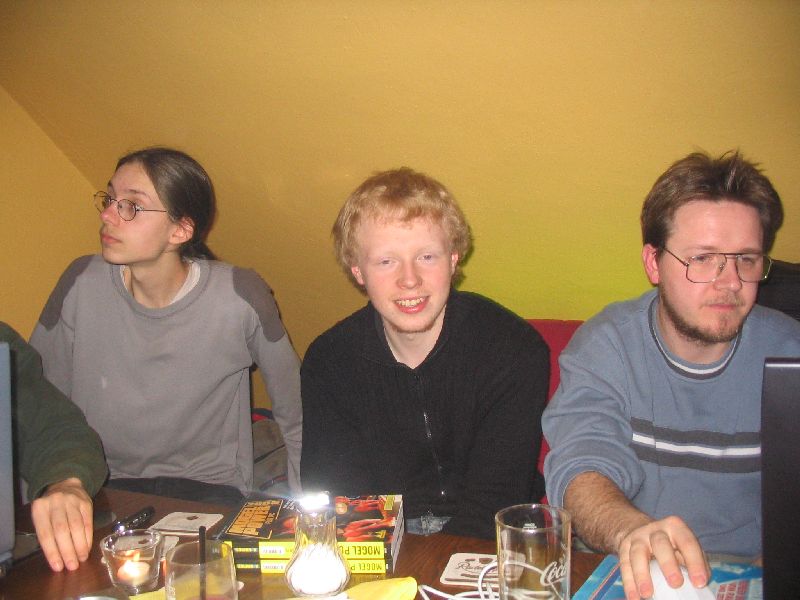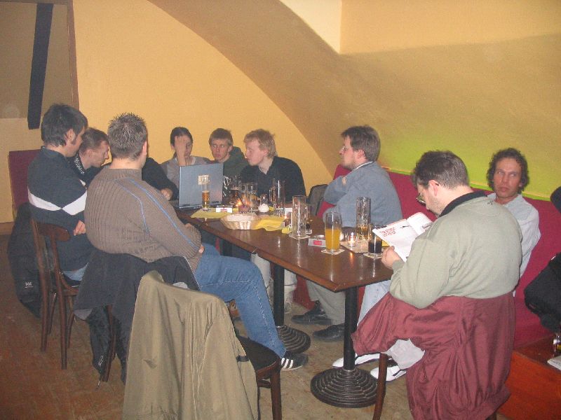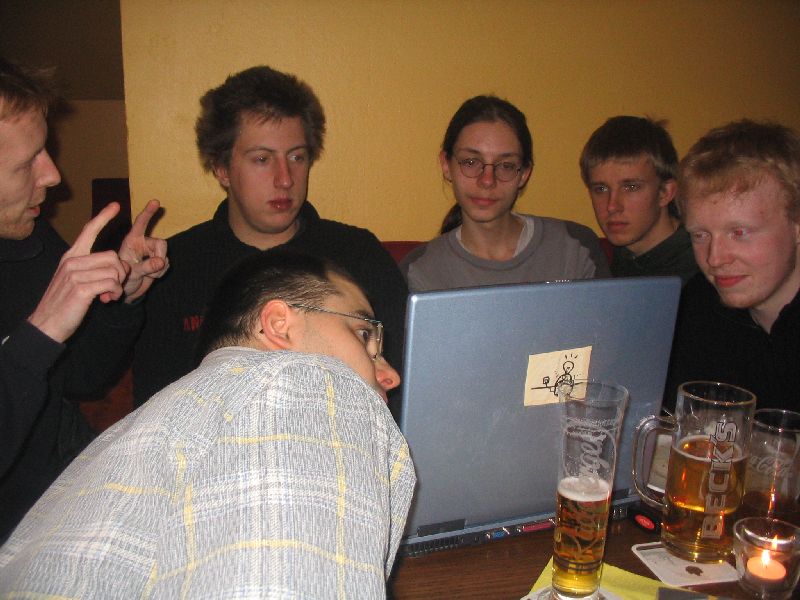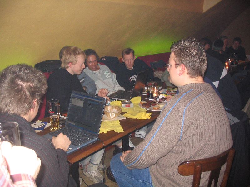 Es waren sagenhaft viele Leute da - neben den üblichen Verdächtigen erstmals: MasterK (extra aus Cottbus angereist), D2006 (Chemnitz), ChrW (der erst seit kurzem in Leipzig wohnt und Textadventures entwickelt; aber wir kriegen ihn noch rum) und DerHase (der im ersten Semester in Leipzig studiert).