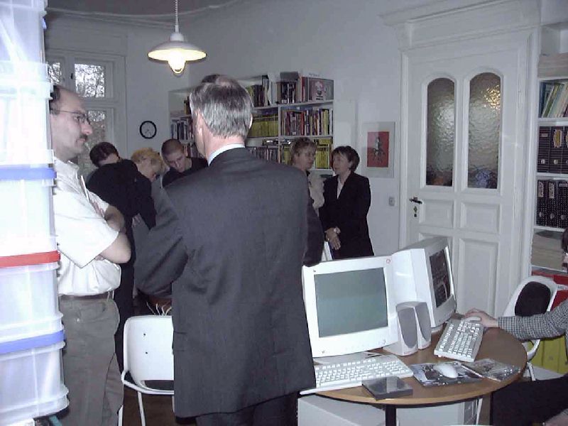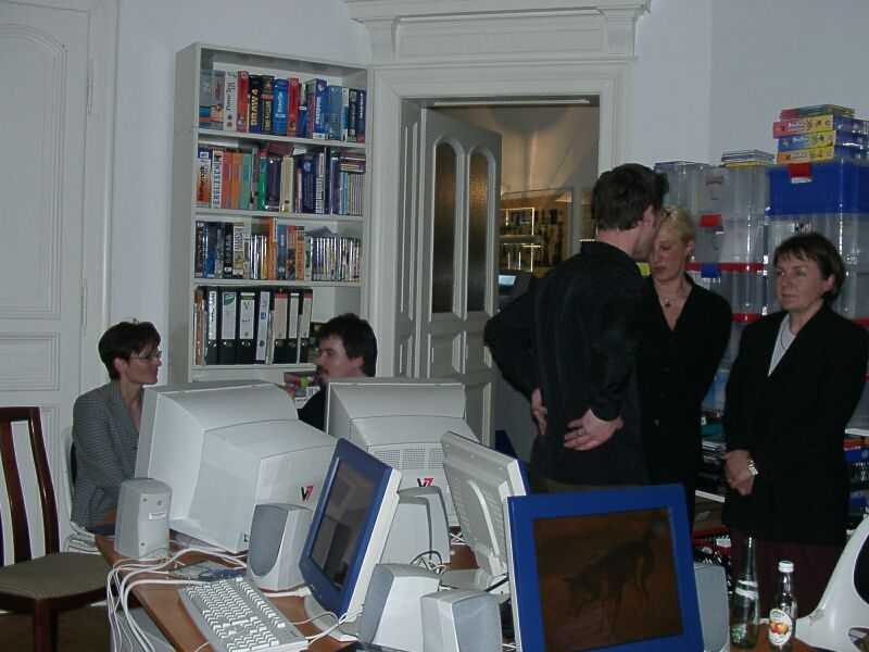 Rechts: Gastgeber René Meyer @ schreibfabrik.de. Im Vordergrund: Ein sündhaft teurer 3D-Zaubermonitor. |