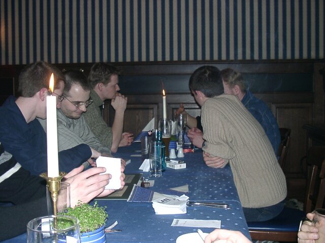 Eifriges Pläneschmieden nach dem Hauptgang. Ganz links: Joe (kaum zu sehen) und Tom @ spieleflut.de. Rechte Seite: kultspiele.net. |