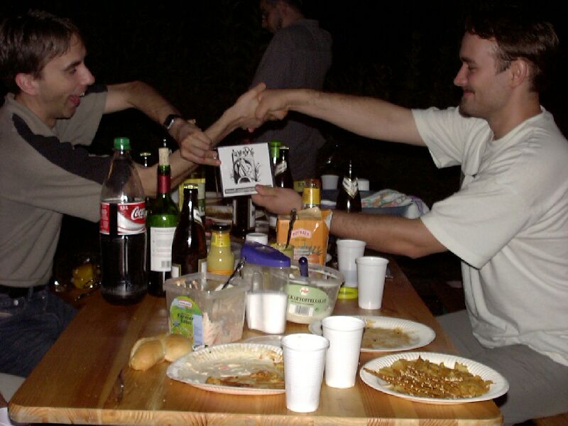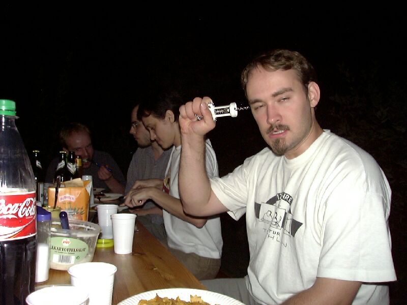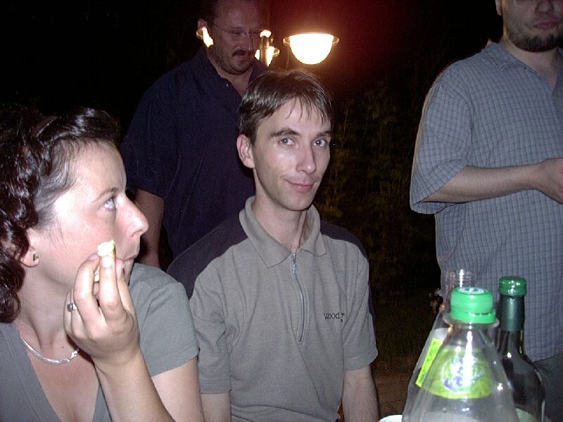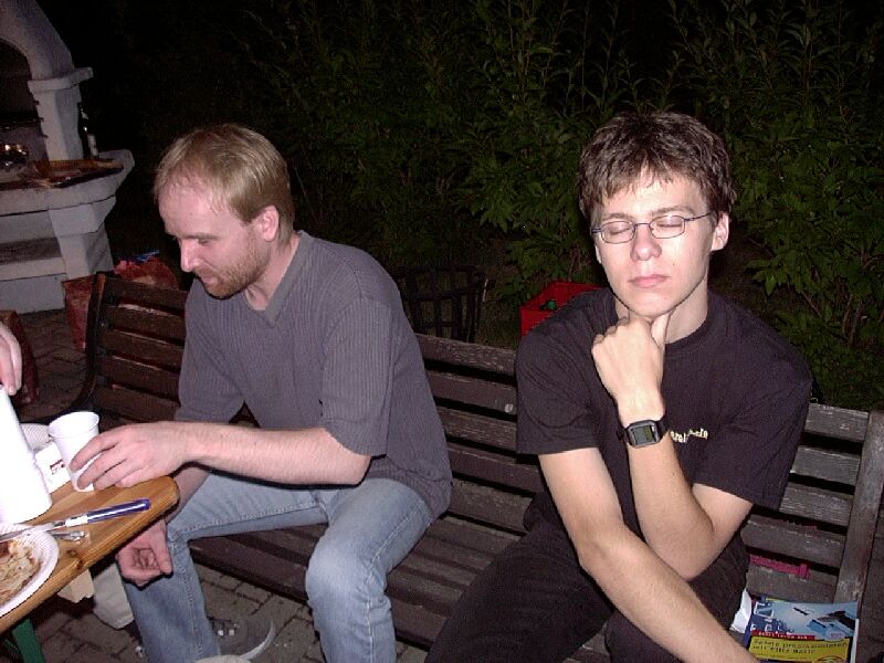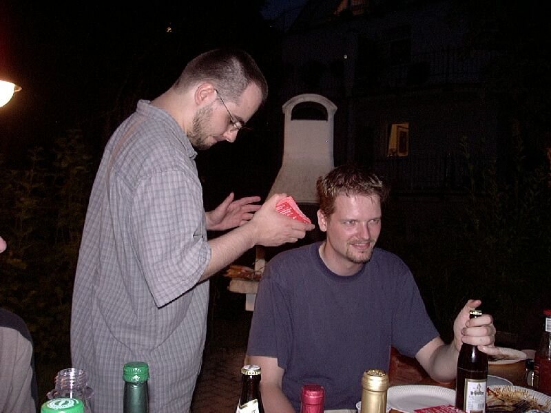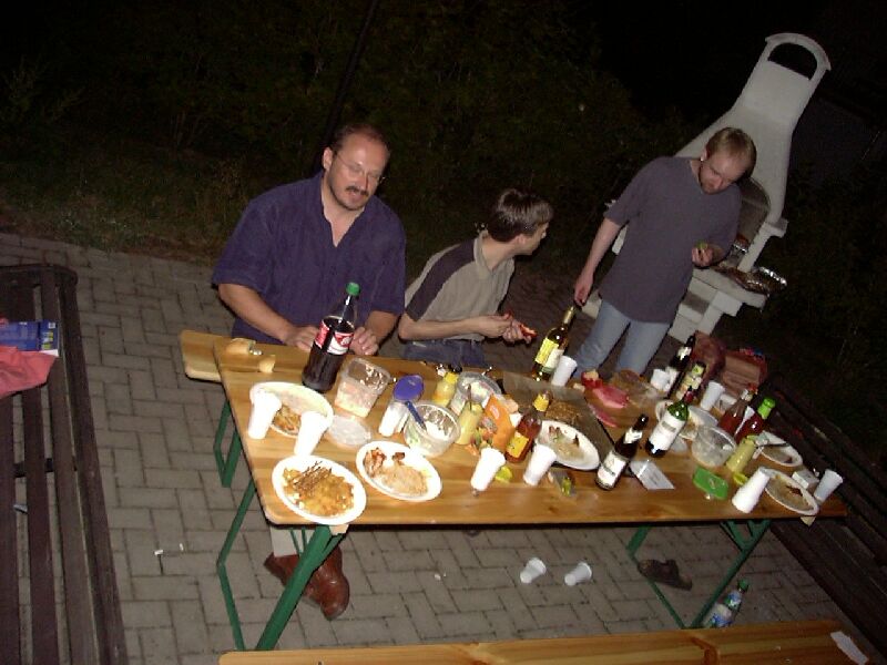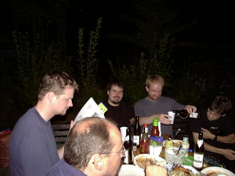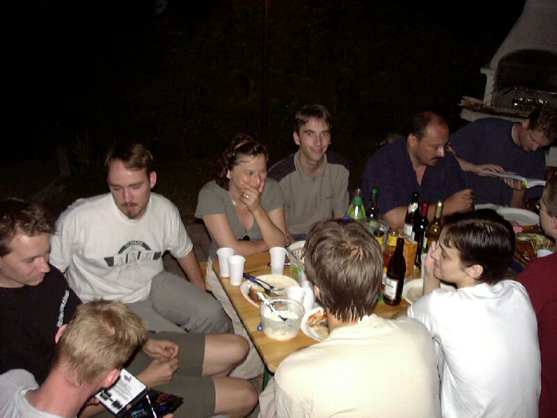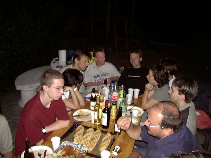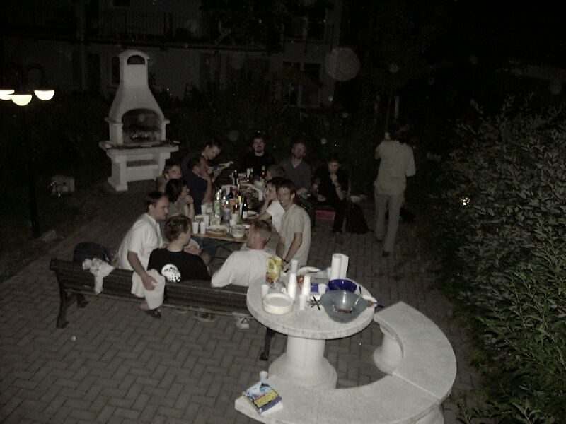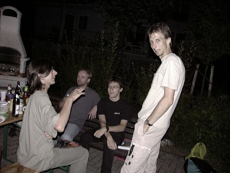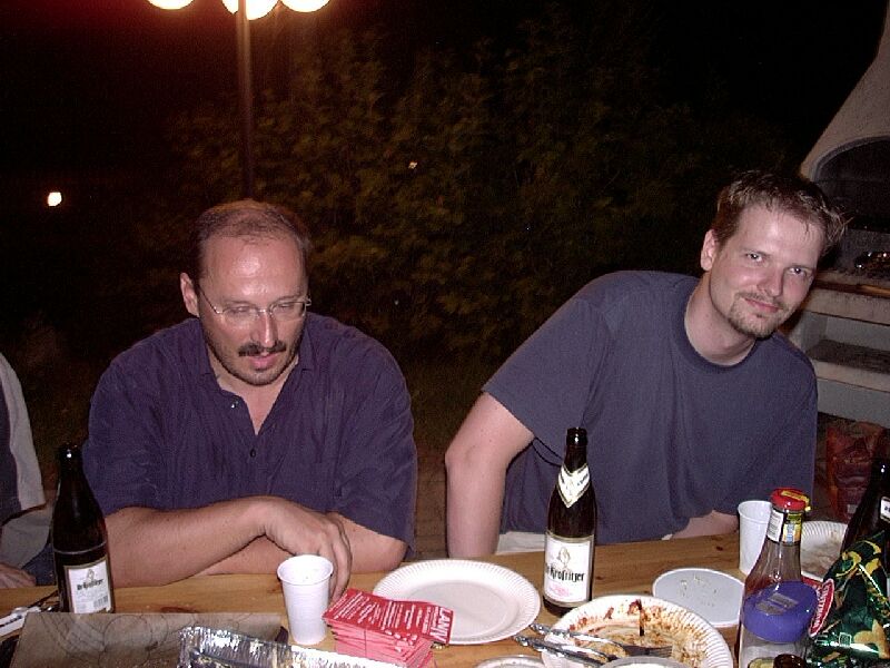 Der 22. Stammtisch war in mehrerer Hinsicht bemerkenswert: Zum einen waren mit 16 Teilnehmern besonders viele da. Zum zweiten war das Wetter besonders schön. Zum dritten waren wir nicht in einer Gaststätte, sondern grillten in Katjas Garten. Zum vierten ging er besonders lang: Erst weit nach Mitternacht lichteten sich die Reihen; der harte Kern hielt bis gegen 5 durch.