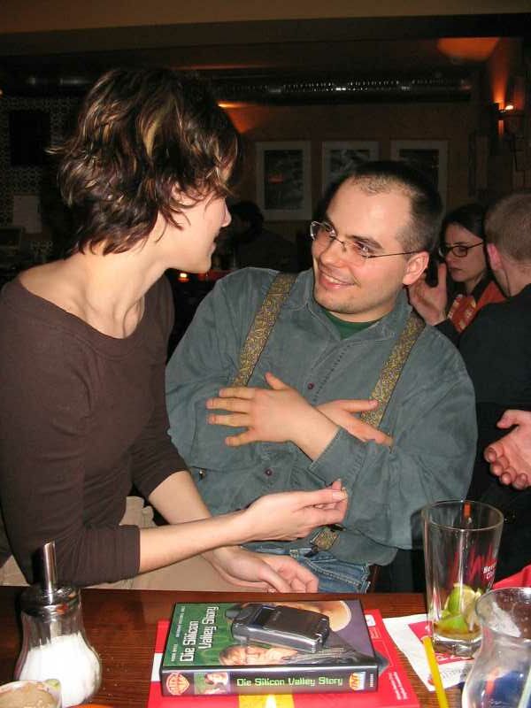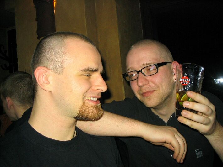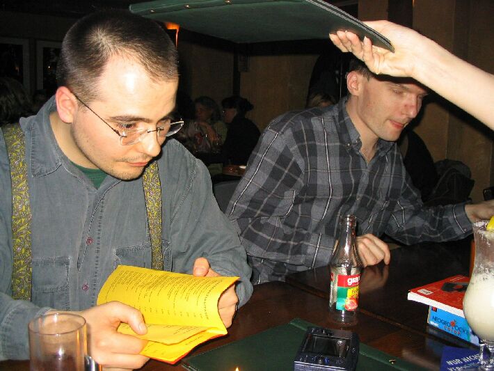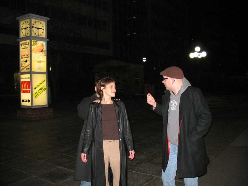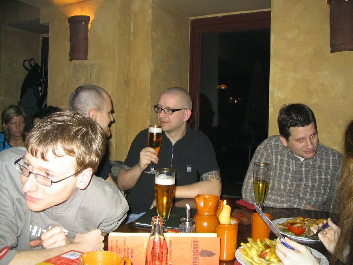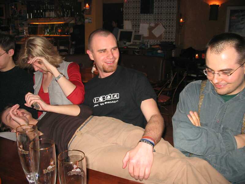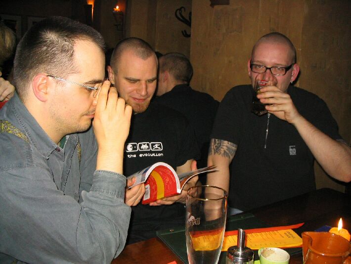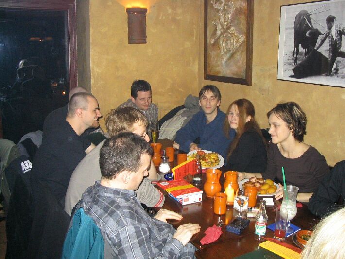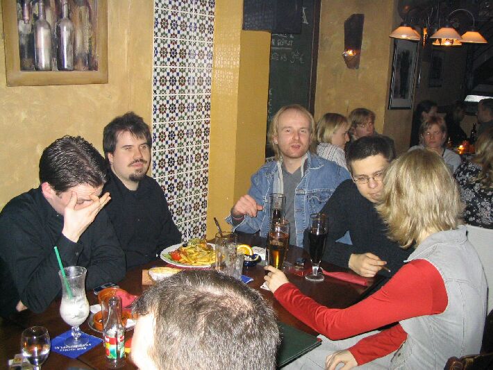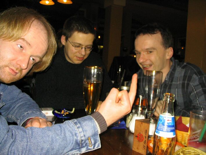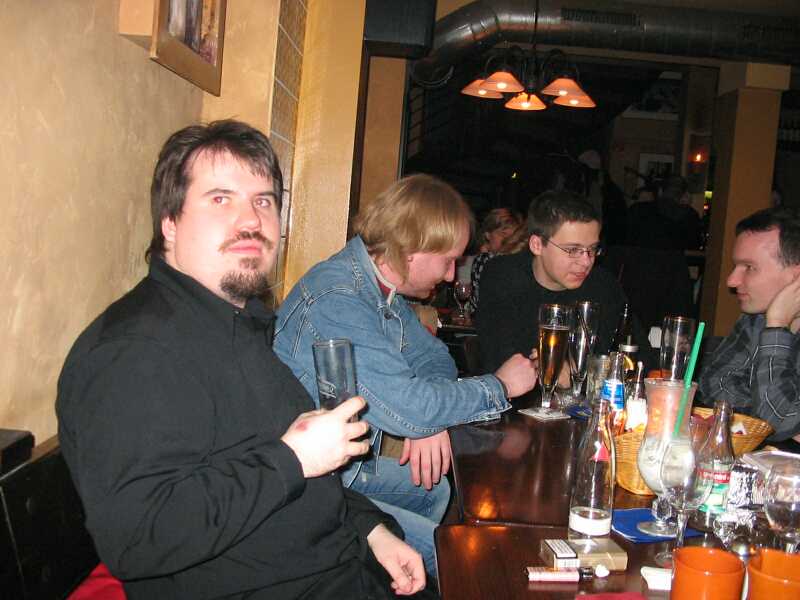 Zahlenmäßig waren wir besonders gut bestückt: Neben selteneren Gästen wie Sven, Nathe, Charlotte, Daniel und Ralph waren Christian "pzyko" Böhme aus München und Wolfgang "WolleB" Böhme aus Chemnitz da. Bis gegen 1 blieben wir. Der harte Kern (Christian, Wolfgang, René, Katja) zog zunächst in die Moritzbastei, dann in die Disco Spizz.