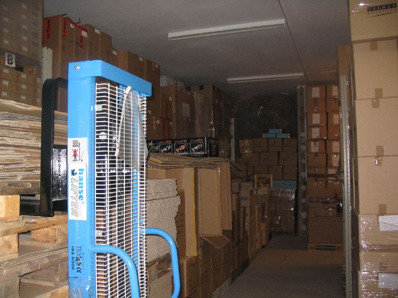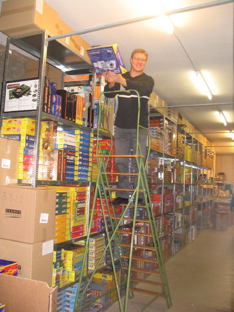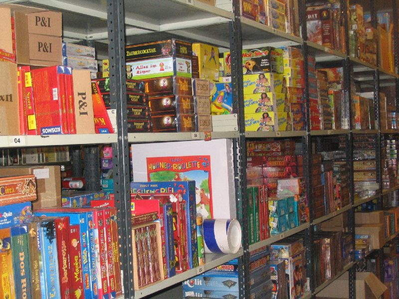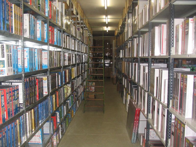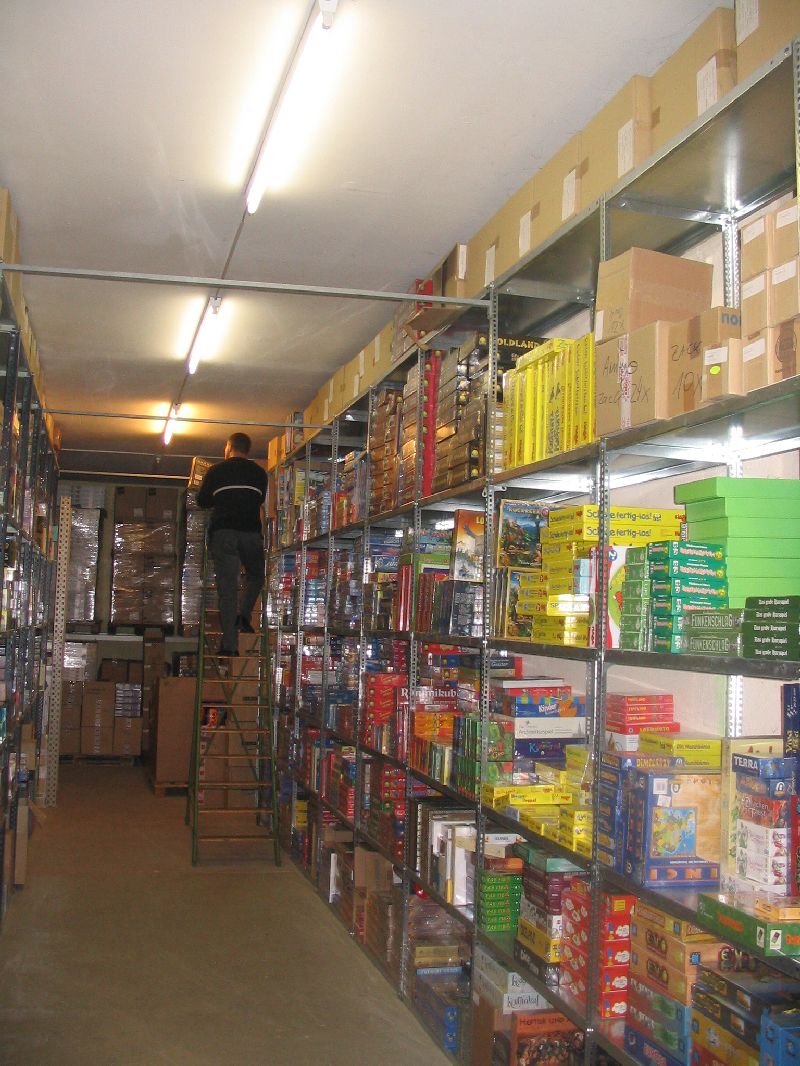Das riesige Lager von Spiele-Offensive.de. Es gibt fünf dieser Regalreihen. |