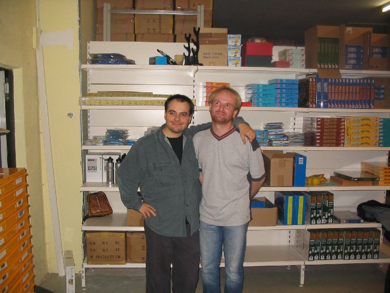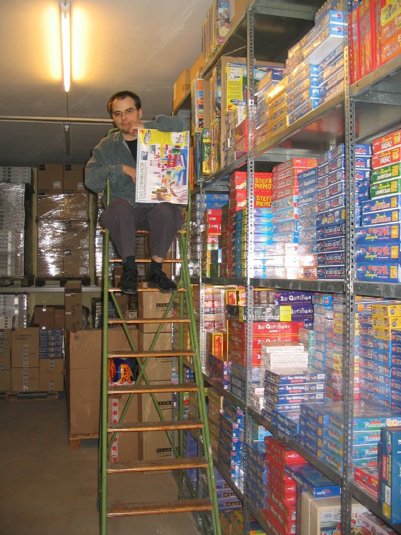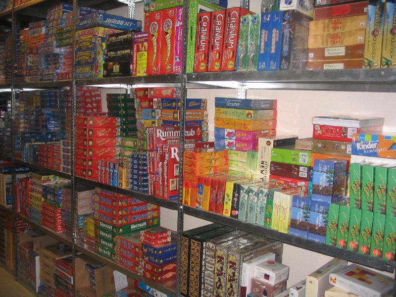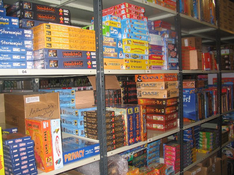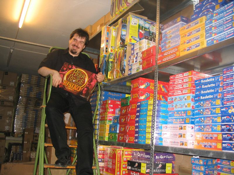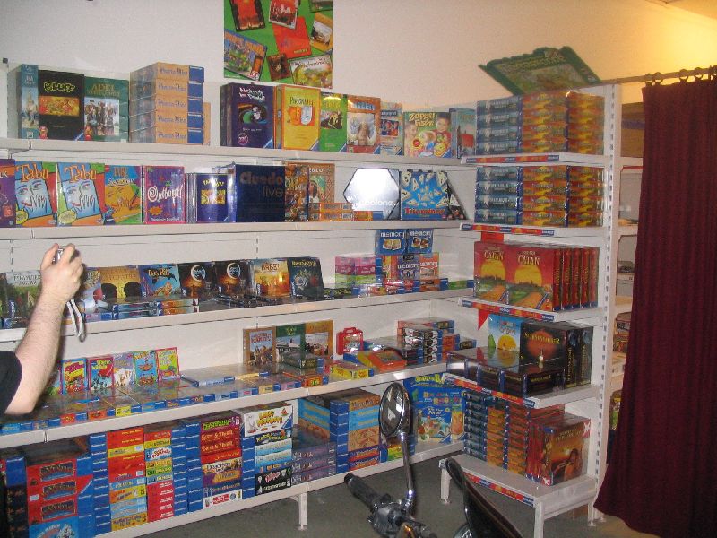 Zum zweiten Mal fand der Stammtisch außerhalb von Leipzig statt - das Ereignis wurde mit Roberts Geburtstagfeier zusammengelegt. Der weite Anfahrtsweg lohnte sich jedoch: Wir konnten ausgiebig das riesige Lager von www.Spiele-Offensive.de bewundern, des Ladengeschäfts und Online-Shops von Robert und Frank. In langen Regalreihen stapeln sich Tausende von Regalreihen mit Brettspielen. Stundenlang konnten wir stöbern, und natürlich machten die Betreiber ein gutes Geschäft an diesem Abend.